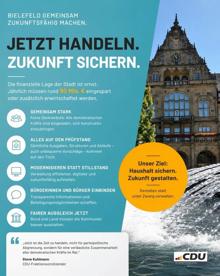 Bielefeld steht vor einer großen finanziellen Herausforderung: Rund 90 Mio. ? müssen jährlich eingespart oder zusätzlich erwirtschaftet werden. Klar ist für uns: Wegducken ist keine Option.